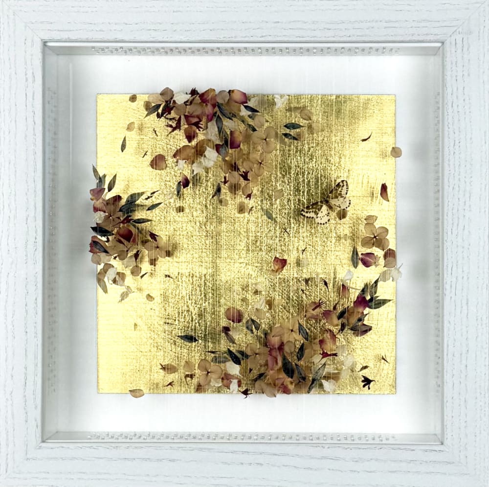 Rose, hydrangea, cornflower and delphinium petals and ruscus leaves with a real moth on gold leaf