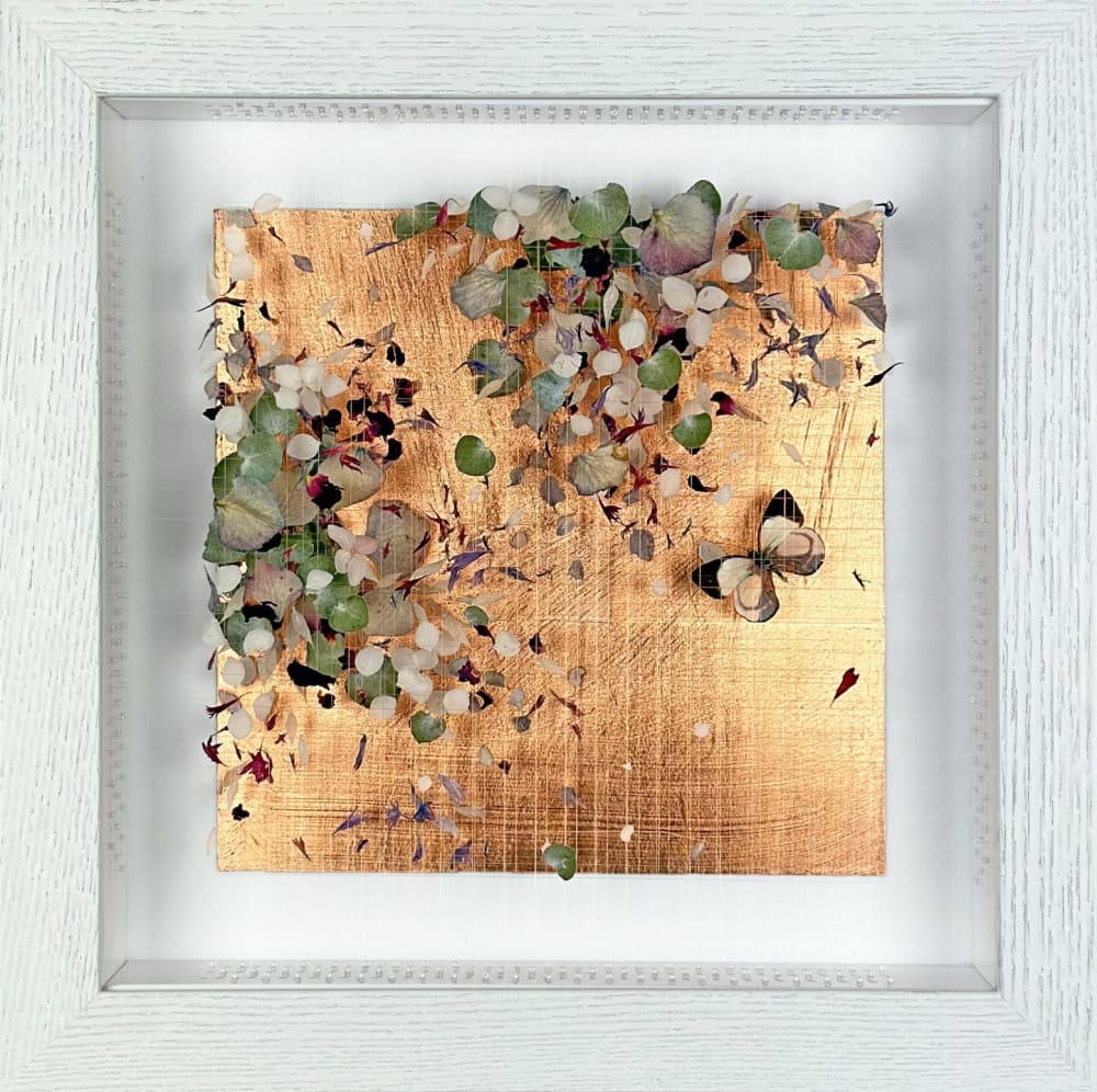 Rose, hydrangea, cornflower and delphinium petals with eucalyptus and ruscus leaves with a real butterfly on copper leaf