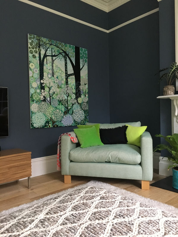 Employing seductively thick, smooth layers of acrylic paint, Katie crafts her subject matter with intricate patterns, blurring the line between abstract and representational, evoking the energy of nature. Katie’s paintings are greatly influenced by an extended trip to India where she was inspired by its vast palaces. These were decorated with beautiful intricate patterns composed of gemstones and mirrors, delicate miniature paintings and richly coloured textiles. With their colourful, jewel-like quality, Katie achieves a harmonious balance, offering an idealised serenity with an underlying sense of excitement, encouraging viewers to find new areas of the image to explore.
